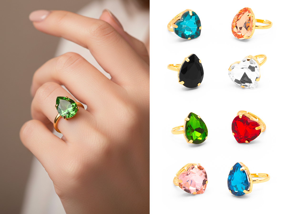 CORTINA POLO STYLE. ANELLO REGOLABILE A CUORE E A GOCCIA IN METALLO E VETRO. MISURE: CUORE MM 15 - GOCCIA MM 18. MODELLI E COLORI ASSORTITI. CONFEZIONE: ELEGANTE SACCHETTO IN VELLUTO.