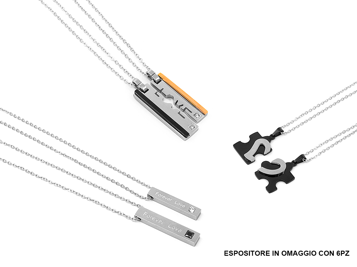 NAVIGARE. PREZZO A COPPIA. COLLANA LOVE. COPPIA DI COLLANE REALIZZATE CON UNA CATENINA GIROCOLLO E UN CIONDOLO COORDINATO. MODELLI ASSORTITI. CONFEZIONE: SCATOLA E SHOPPER.