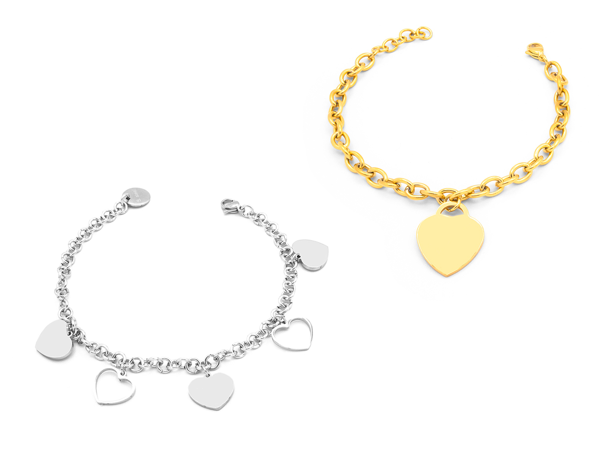 POLO CORTINA STYLE. BRACCIALE DA DONNA IN ACCIAIO CON PENDENTI A CUORE ORO E RODIO. MODELLI ASSORTITI. CONFEZIONE: SCATOLA E SHOPPER.