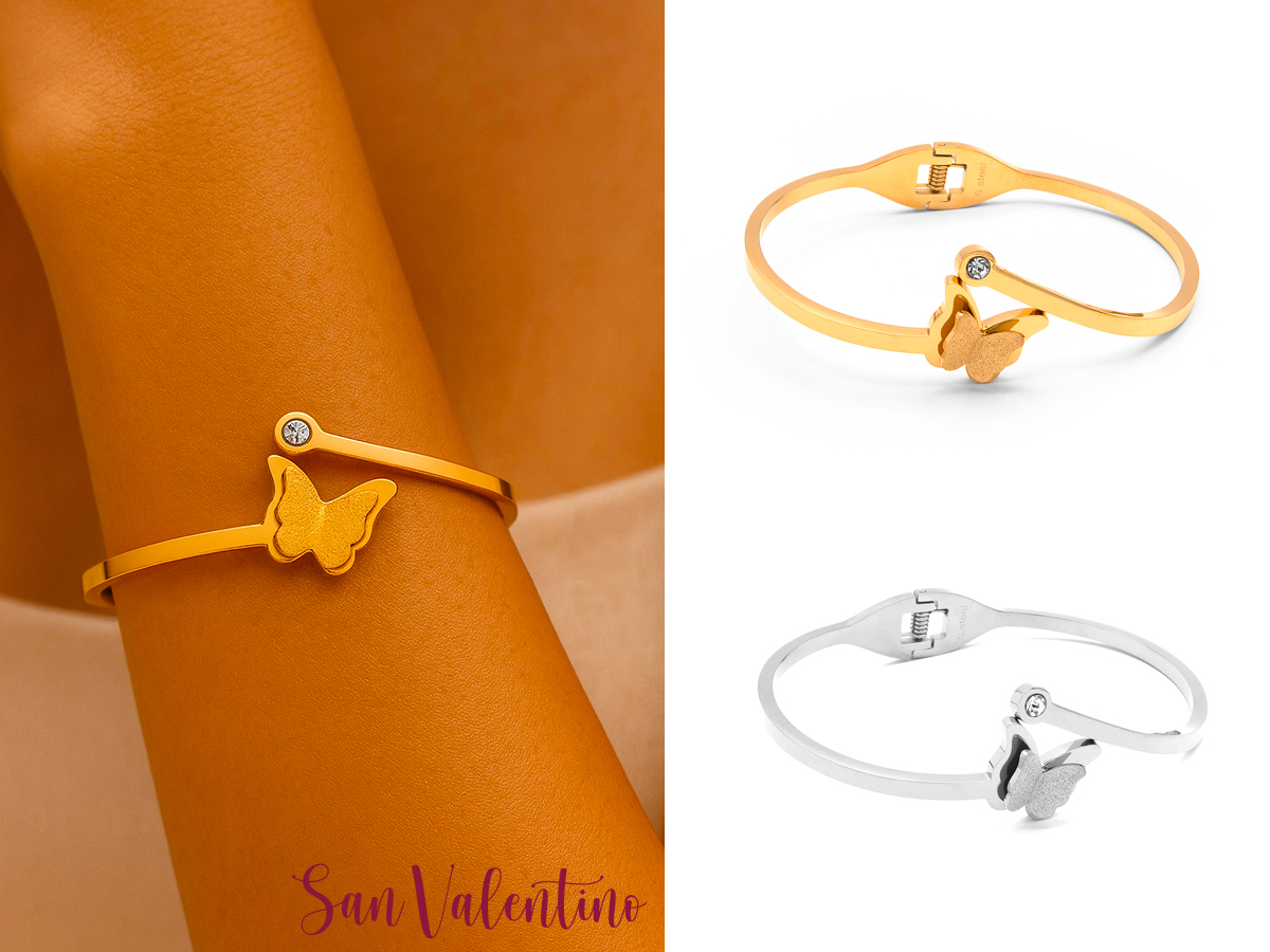 CORTINA POLO STYLE. BRACCIALE RIGIDO DA DONNA CON FARFALLA. MATERIALE: ACCIAIO E ZIRCONI. COLORI ASSORTITI. CONFEZIONE: SCATOLA E SHOPPER.