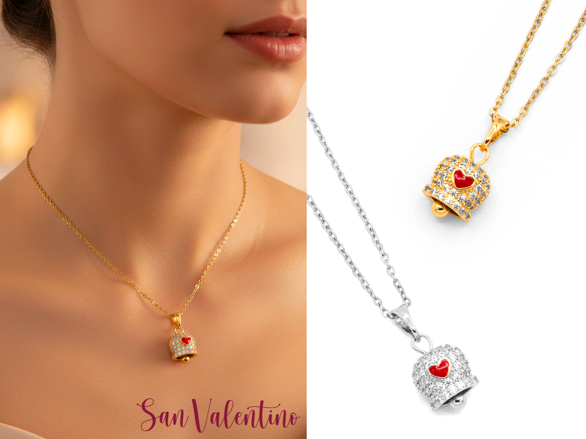 POLO CORTINA STYLE. COLLANA DA DONNA IN ACCIAIO CON PENDENTE A CAMPANELLA CON CUORE. LUNGHEZZA COLLANA: DA 39 CM A 44 CM. COLORI ASSORTITI. CONFEZIONE: SCATOLA E SHOPPER.