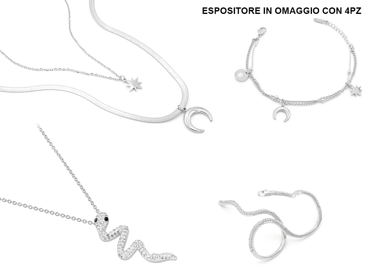 parure in 2 modelli: - collana e bracciale: collana realizzata con doppia catenina e ciondoli a forma di astri, bracciale con ciondoli coordinati - collana e anello: collana realizzata con una sottile catenina e un ciondolo a forma di serpente impreziosito da cristalli, anello avvolgente coordinato modelli assortiti CONFEZIONE: SCATOLA IN VELLUTO E SHOPPER.