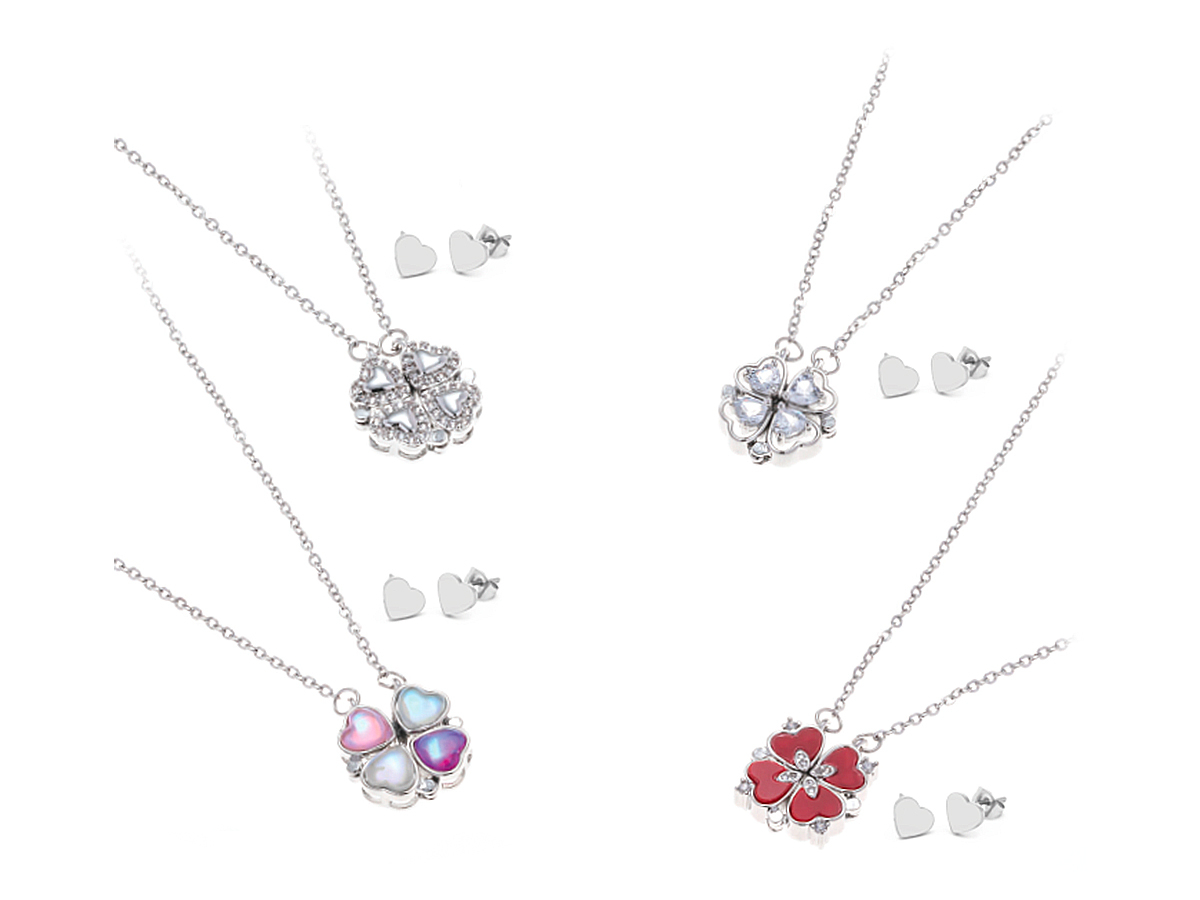 NAVIGARE. PARURE DA DONNA IN METALLO. COLLANA CON CIONDOLO FIORE IMPREZIOSITO DA STRASS I 4 PETALI CON CALAMITA POSSONO DIVENTARE 4 CUORI IN FILA. ORECCHINI LOBO A FORMA DI CUORE. MODELLI E COLORI ASSORTITI. CONFEZIONE: SCATOLA E SHOPPER.