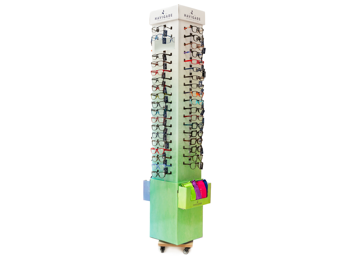 ESPOSITORE DA TERRA IN CARTONE PLASTIFICATO GIREVOLE PER ESPORRE 72 OCCHIALI. DIMENSIONI: H 175 cm BBASE 28x28cm