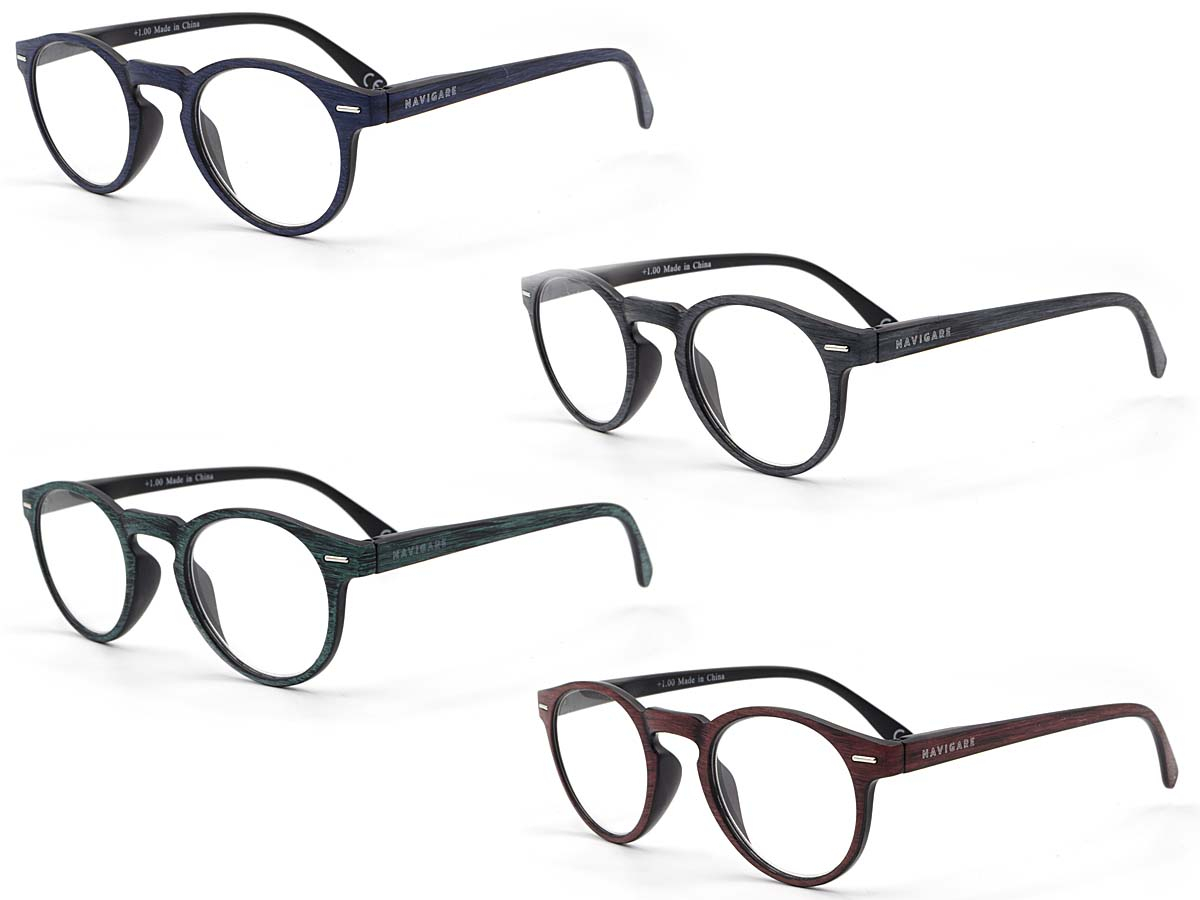 Effetto "legno opaco" con finitura satinata occhiale da lettura in policarbonato Asta con sistema "flex" per una migliore adattabilità al viso Assortimento in 4 colori: rosso scuro/nero - blu/nero - grigio scuro/nero - verde/nero - A CORREDO CUSTODIE RIGIDE ED ASTUCCI MORBIDI