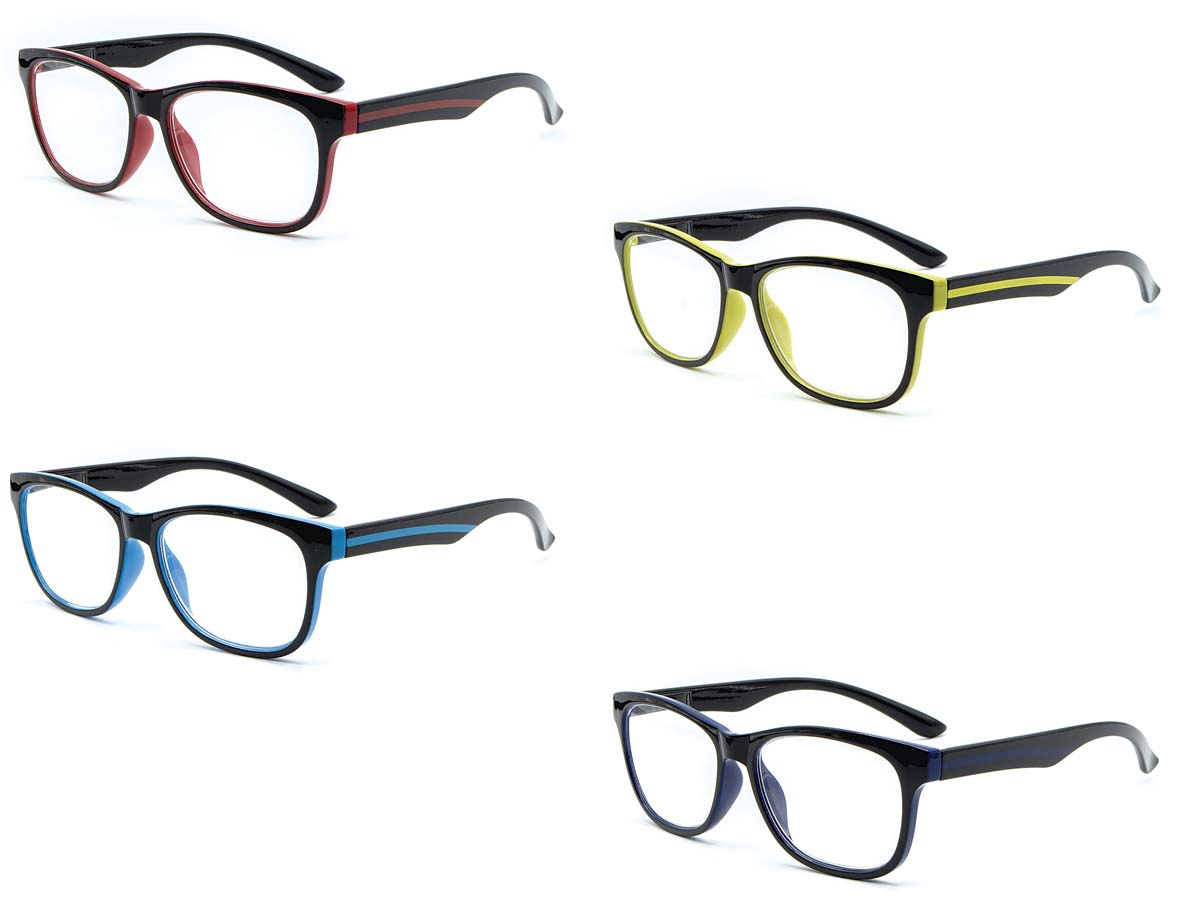 Finitura "lucida" bicolore occhiale da lettura in policarbonato- Asta con sistema "flex" per una migliore adattabilità al viso - Astucci in dotazione - Assortimento in 4 colori: nero/rosso - nero/giallo - nero/azzurro - nero/blu