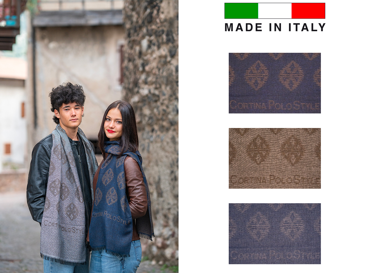 CORTINA POLO STYLE. SCIARPA UNISEX DOUBLE FACE FANTASIA ROMBI MADE IN ITALY. COMPOSIZIONE: LANA 15% - CASHMERE 8% - MODAL 23% - POLY 27% - VISCOSA 27%. MISURA CM. 35X180. COLORI ASSORTITI. A CORREDO ELEGANTE SHOPPER.
