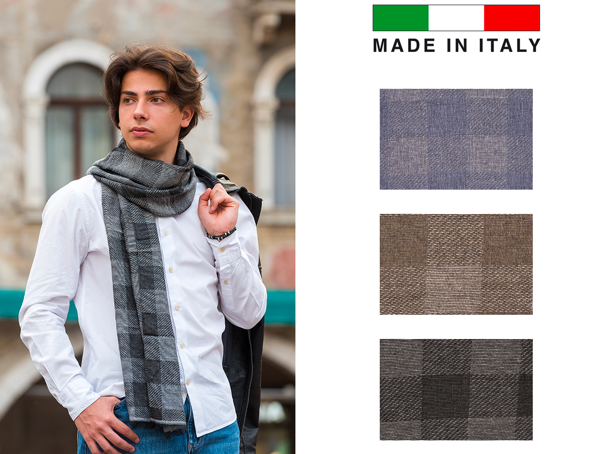 CORTINA POLO STYLE. SCIARPA DA UOMO DOUBLE FACE FANTASIA QUADRI MADE IN ITALY. COMPOSIZIONE: LANA 15% - CASHMERE 8% - MODAL 23% - POLY 27% - VISCOSA 27%. MISURA CM. 45X180. COLORI ASSORTITI. A CORREDO ELEGANTE SHOPPER.