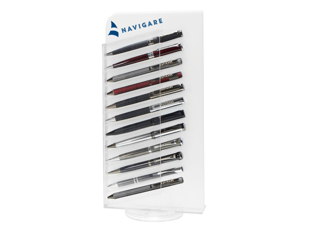 NAVIGARE. ESPOSITORE IN PLEXIGLASS GIREVOLE A 2 LATI per esporre 24 penne DIMENSIONI: 17cm X 5 cm H 34 cm