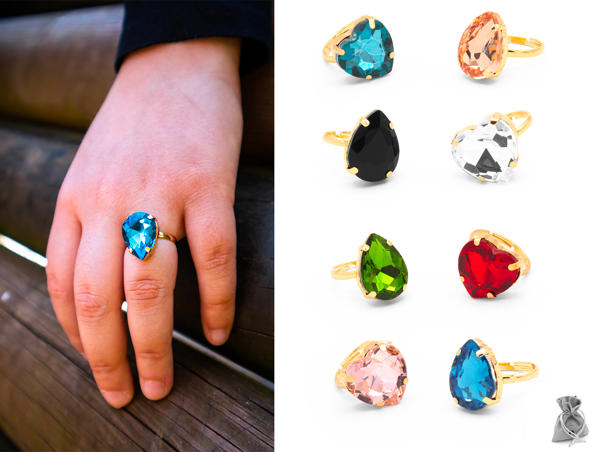 CORTINA POLO STYLE. ANELLO REGOLABILE A CUORE E A GOCCIA IN METALLO E VETRO. MISURE: CUORE MM 15 - GOCCIA MM 18. MODELLI E COLORI ASSORTITI. CONFEZIONE: ELEGANTE SACCHETTO IN VELLUTO.
