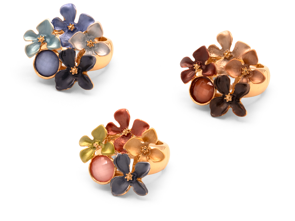 CORTINA POLO STYLE. ANELLO ELASTICO DA DONNA A FIORI IN LEGA DI ZINCO SMALTATA. LARGHEZZA 28 MM. COLORI ASSORTITI. CONFEZIONE: ELEGANTE SACCHETTO IN STOFFA.