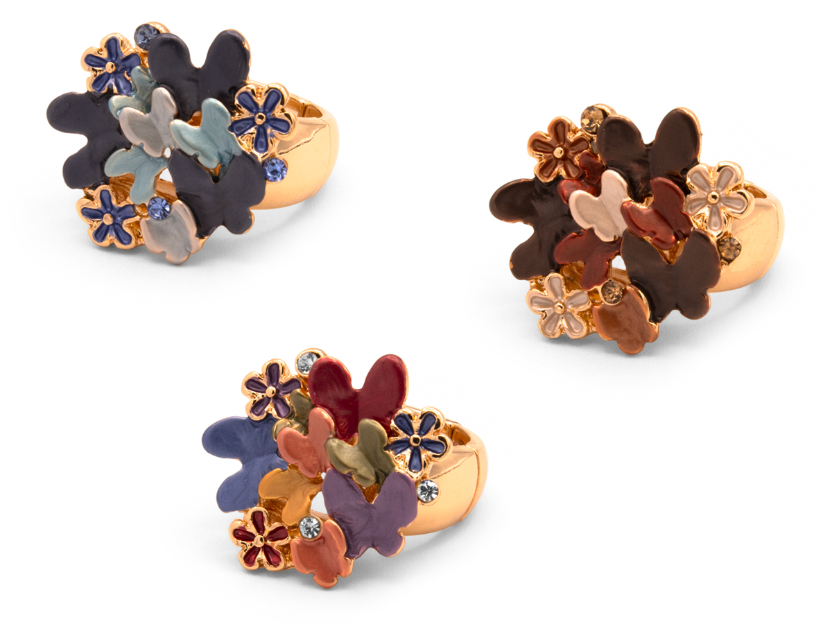 CORTINA POLO STYLE. ANELLO ELASTICO DA DONNA A FIORI E FARFALLA IN LEGA DI ZINCO SMALTATA. LARGHEZZA 28 MM. COLORI ASSORTITI. CONFEZIONE: ELEGANTE SACCHETTO IN STOFFA.