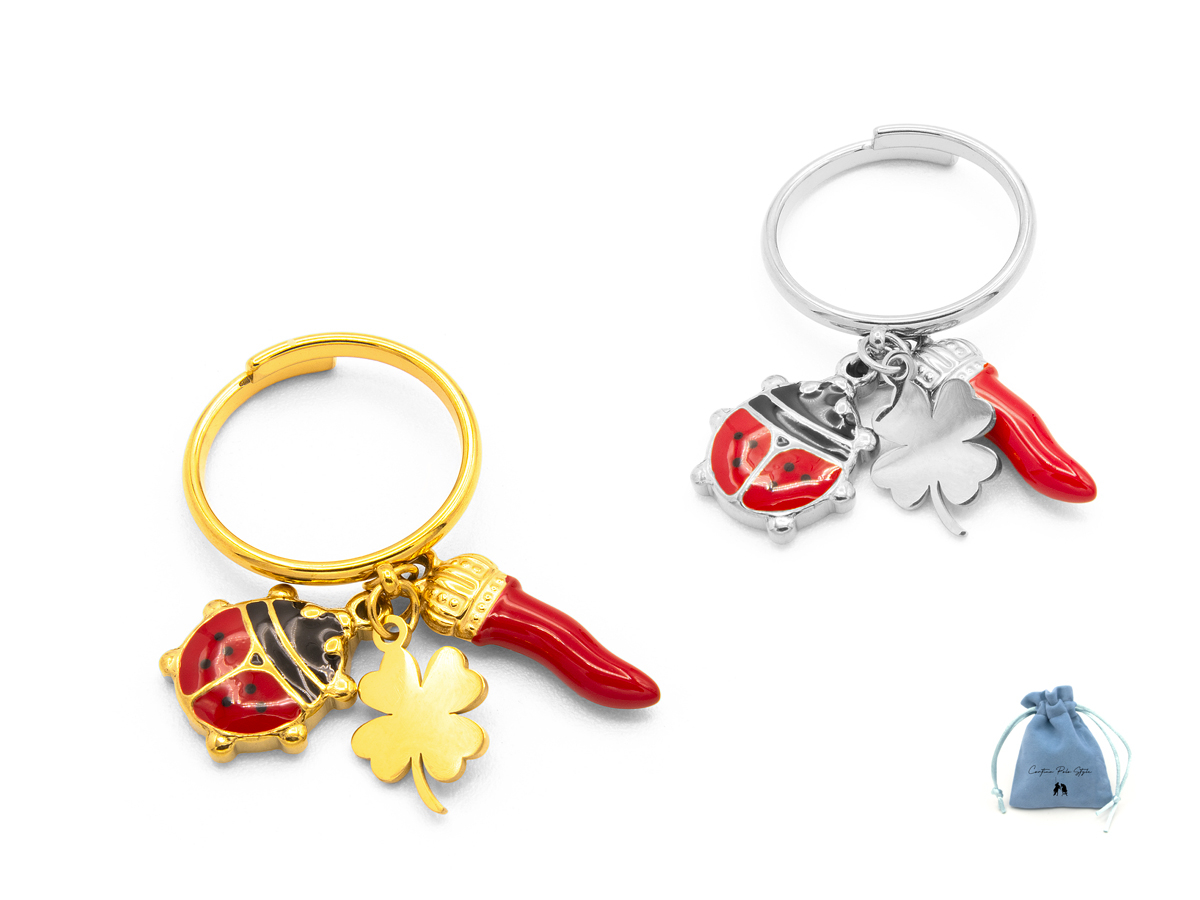 CORTINA POLO STYLE. ANELLO PORTAFORTUNA DA DONNA IN ACCIAIO CON TRIPLO PENDENTE. COLORI ASSORTITI. CONFEZIONE: ELEGANTE SACCHETTO IN VELLUTO.