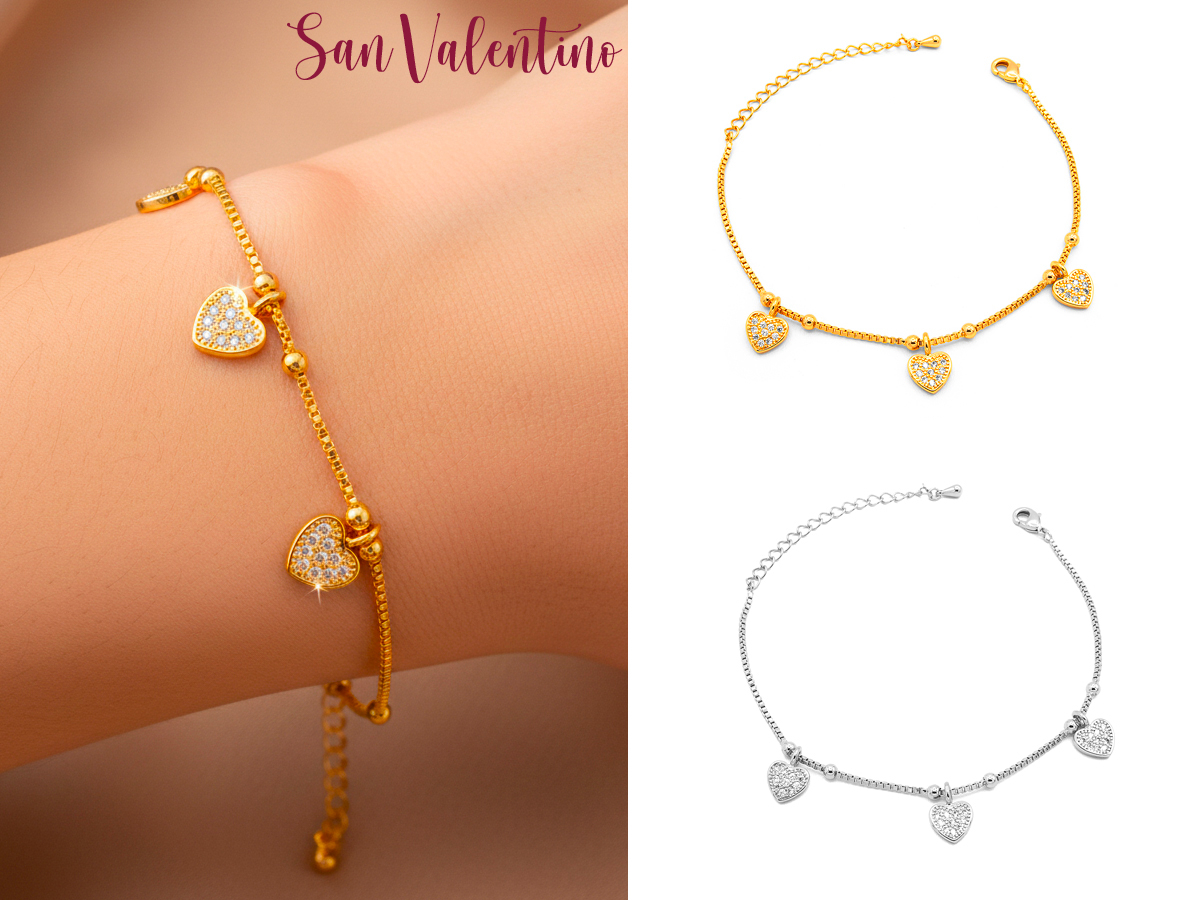 CORTINA POLO STYLE. BRACCIALE DA DONNA CON TRIS DI CUORI E ZIRCONI IN OTTONE. COLORI ASSORTITI. CONFEZIONE: SCATOLA E SHOPPER.