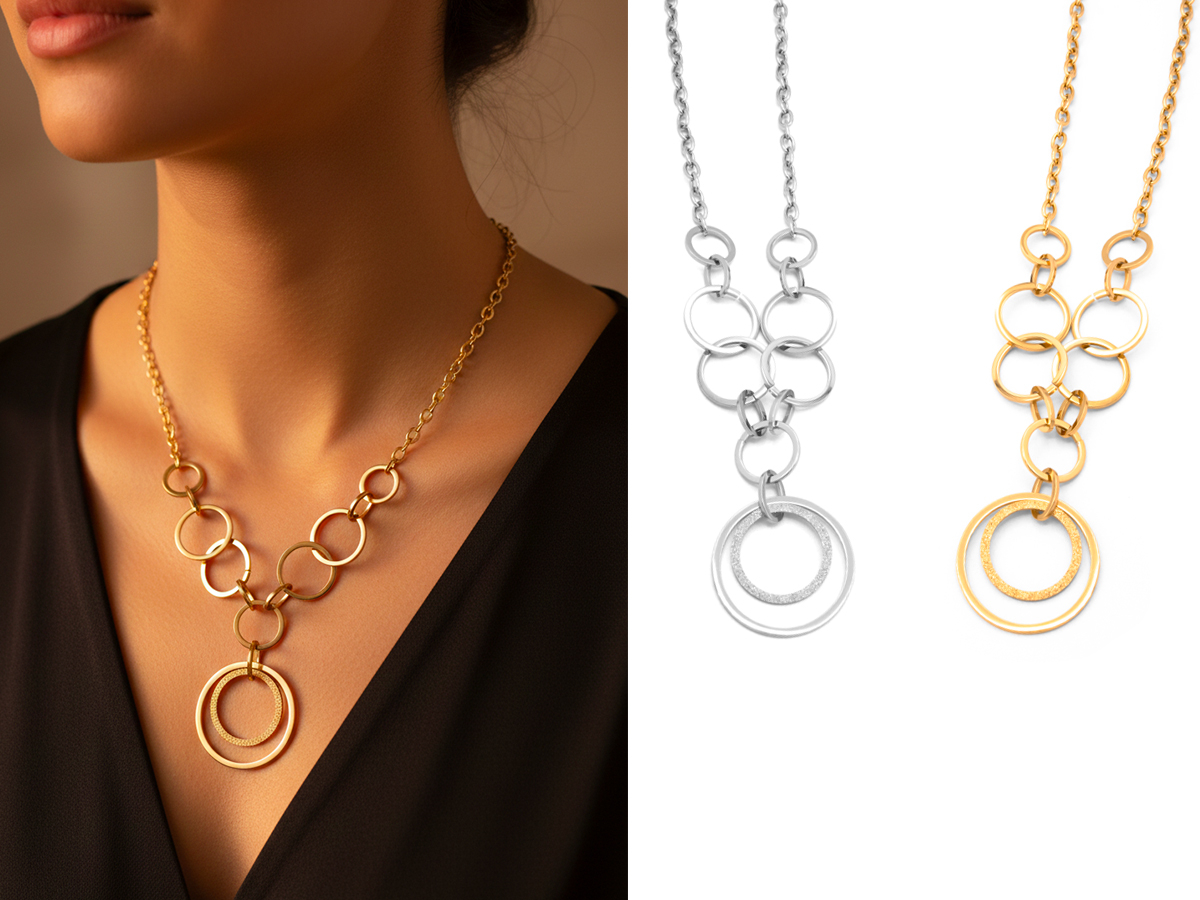 POLO CORTINA STYLE. COLLANA DA DONNA A CERCHI. LUNGHEZZA COLLANA: DA 40 A 45 CM. MATERIALE: ACCIAIO. COLORI ASSORTITI. CONFEZIONE: SCATOLA E SHOPPER.