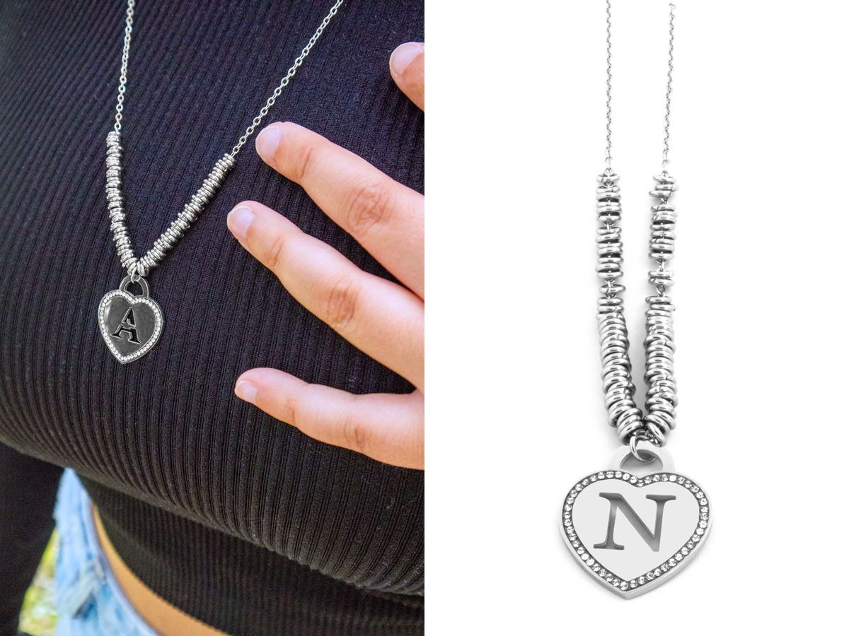 NAVIGARE. COLLANA DA DONNA IN ACCIAIO CON CUORE LETTERA ARRICCHITO DA STRASS. LUNGHEZZA: 45 CM. CONFEZIONE: SCATOLA E SHOPPER.