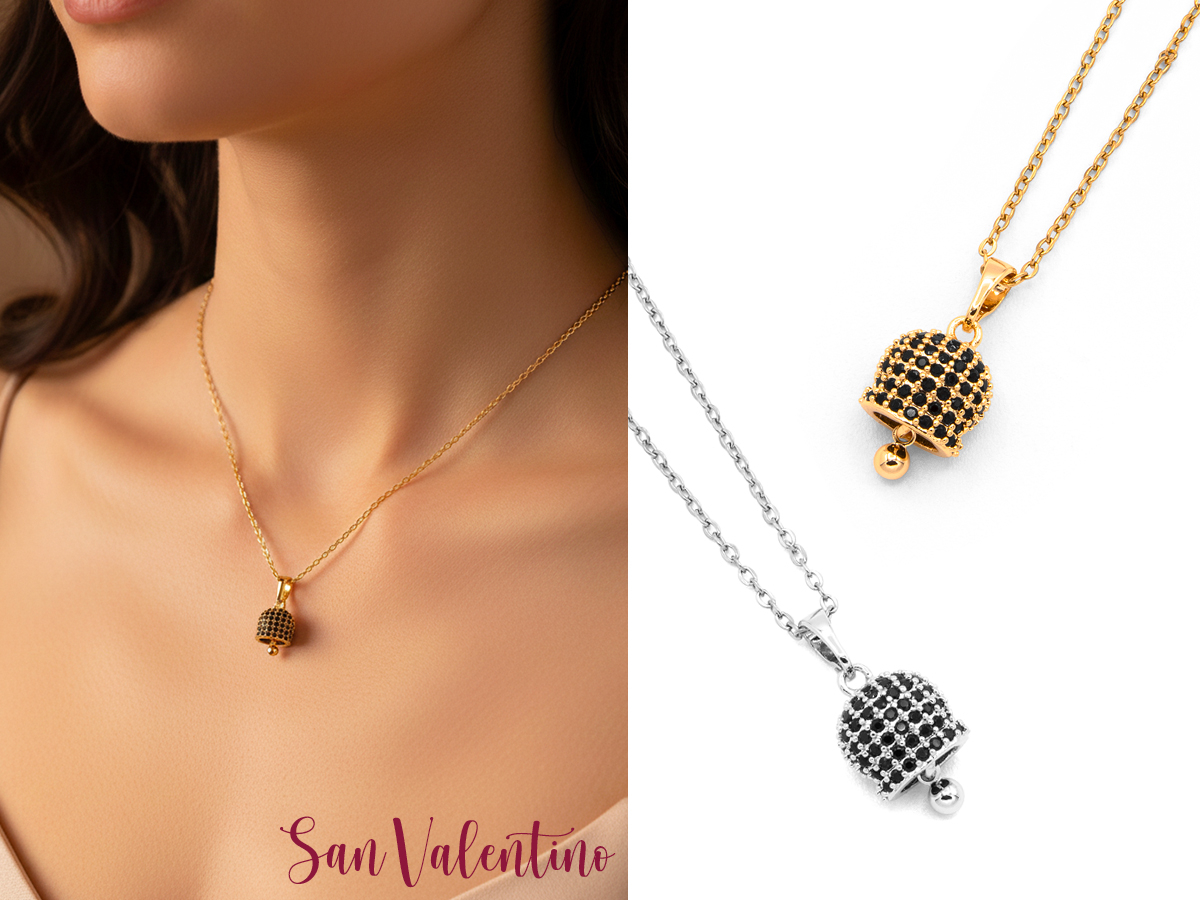 POLO CORTINA STYLE. COLLANA DA DONNA CON PENDENTE A CAMPANELLA. MATERIALE: ACCIAIO, OTTONE E ZIRCONI. LUNGHEZZA COLLANA: DA 39 CM A 44 CM. COLORI ASSORTITI. CONFEZIONE: SCATOLA E SHOPPER.