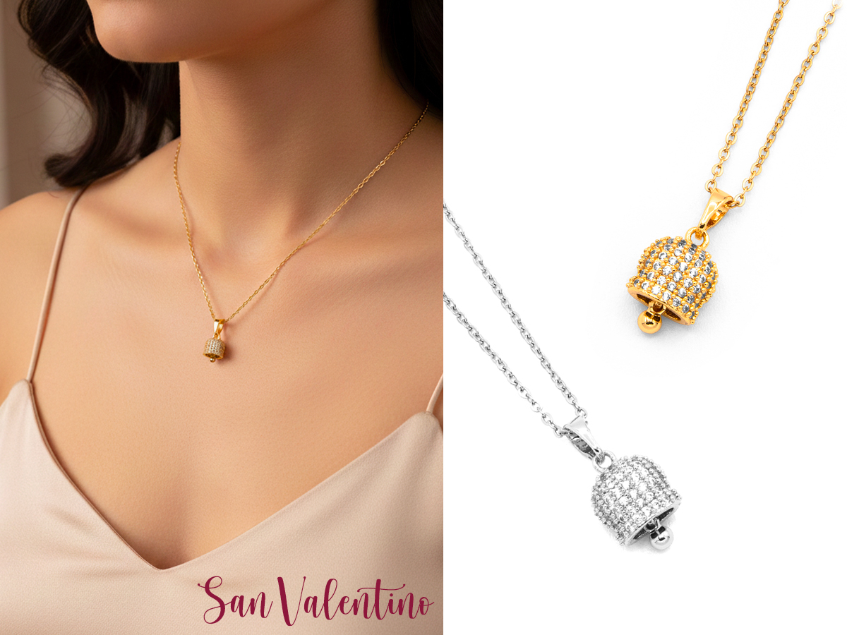 POLO CORTINA STYLE. COLLANA DA DONNA CON PENDENTE A CAMPANELLA. MATERIALE: ACCIAIO, OTTONE E ZIRCONI. LUNGHEZZA COLLANA: DA 39 CM A 44 CM. COLORI ASSORTITI. CONFEZIONE: SCATOLA E SHOPPER.