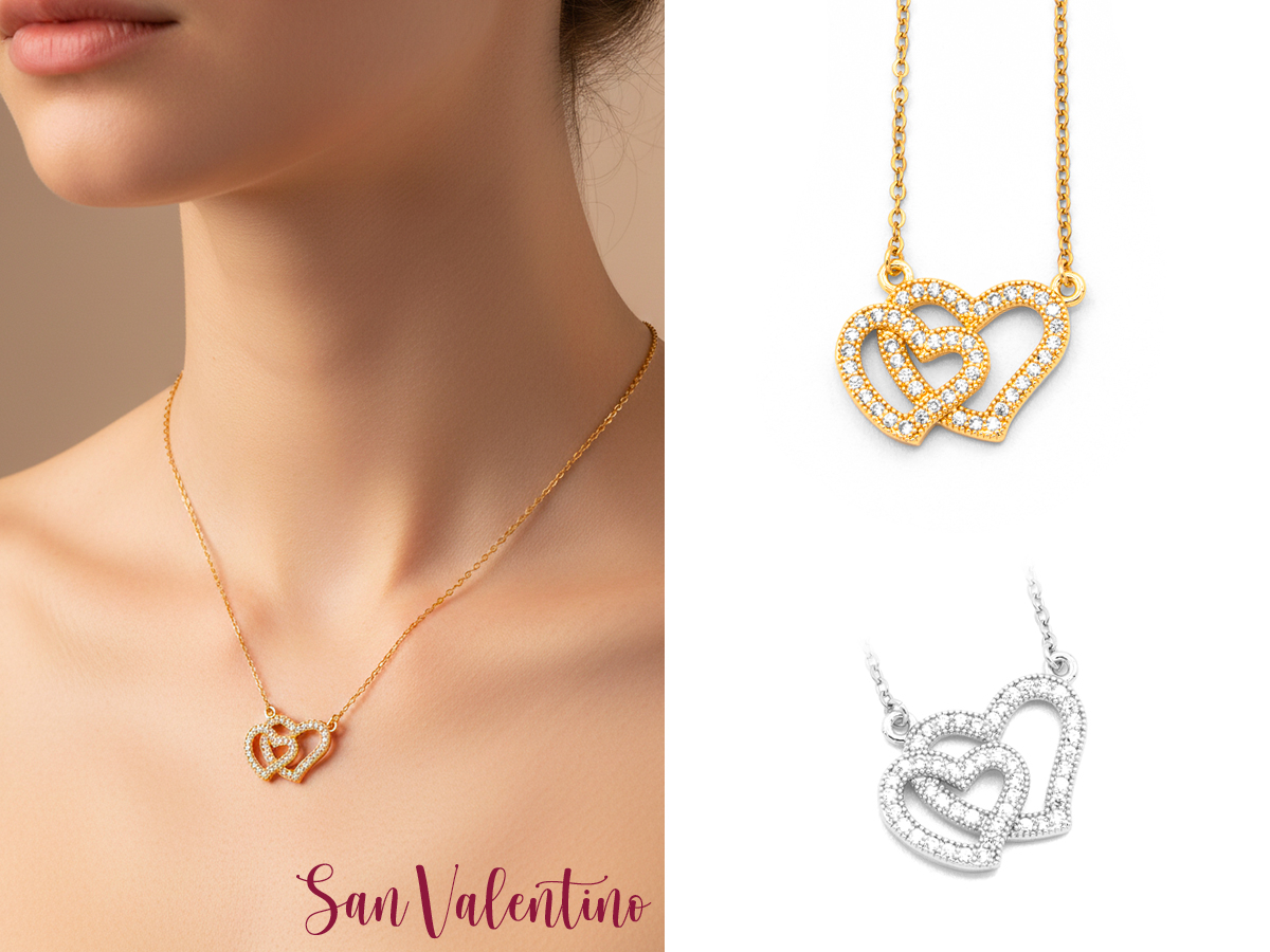 POLO CORTINA STYLE. COLLANA DA DONNA CON PENDENTE A DOPPIO CUORE. MATERIALE: ACCIAIO, OTTONE E ZIRCONI. LUNGHEZZA COLLANA: DA 39 CM A 44 CM. COLORI ASSORTITI. CONFEZIONE: SCATOLA E SHOPPER.