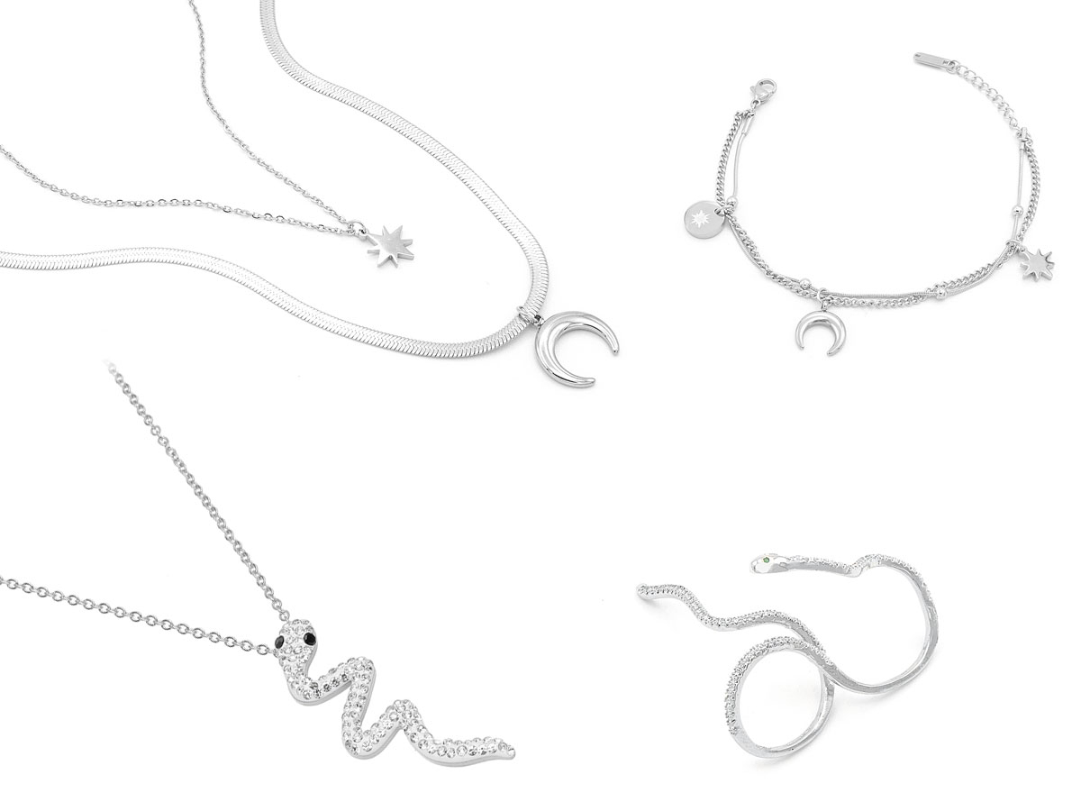 parure in 2 modelli: - collana e bracciale: collana realizzata con doppia catenina e ciondoli a forma di astri, bracciale con ciondoli coordinati - collana e anello: collana realizzata con una sottile catenina e un ciondolo a forma di serpente impreziosito da cristalli, anello avvolgente coordinato modelli assortiti CONFEZIONE: SCATOLA IN VELLUTO E SHOPPER.