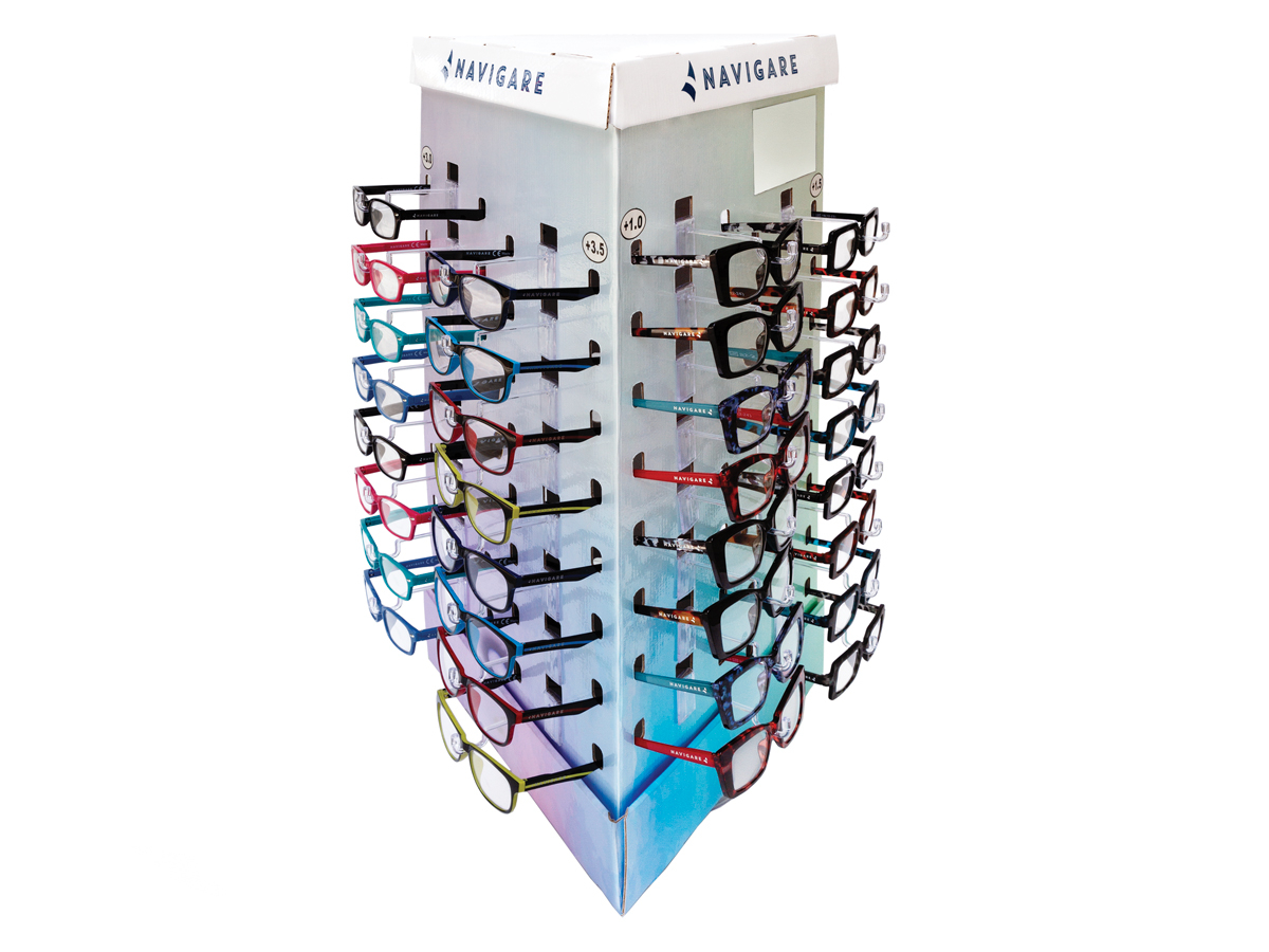 ESPOSITORE DA BANCO GIREVOLE IN CARTONE PLASTIFICATO PER ESPORRE 48 OCCHIALI. DIMENSIONI: H 73,5 CM - BASE 39,5x39,5x39,5 CM. 3 LATI 2 FILE PER LATO.
