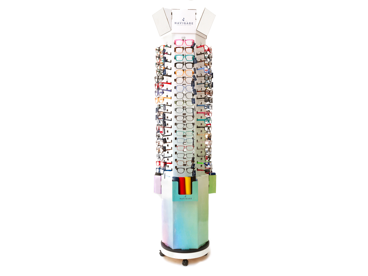 ESPOSITORE DA TERRA IN CARTONE PLASTIFICATO GIREVOLE PER ESPORRE 108 OCCHIALI. DIMENSIONI: H 180 CM - BASE DIAMETRO 41cm