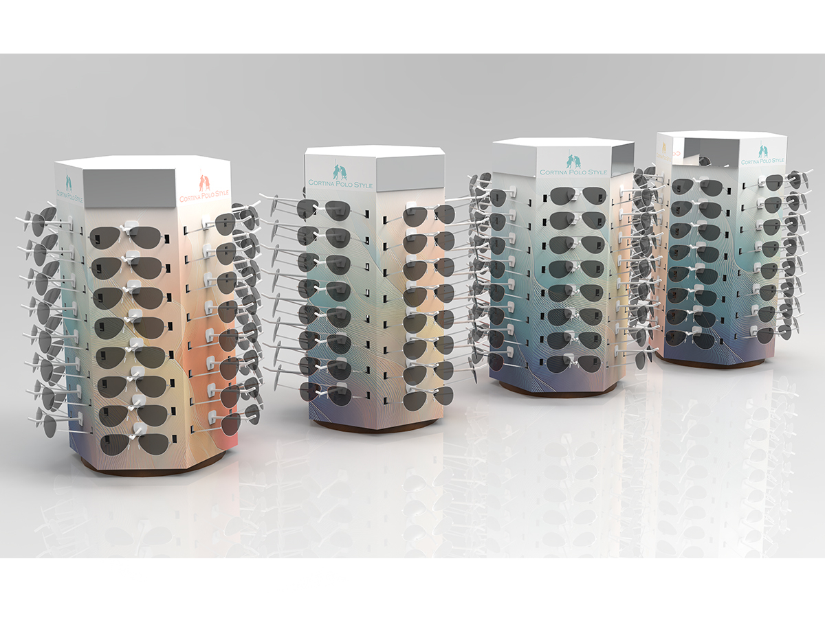 CORTINA POLO STYLE. ESPOSITORE GIREVOLE DA BANCO IN CARTONE PLASTIFICATO PER ESPORRE 48 OCCHIALI. DIMENSIONI: H 71 CM DIAMETRO BASE 40 CM.