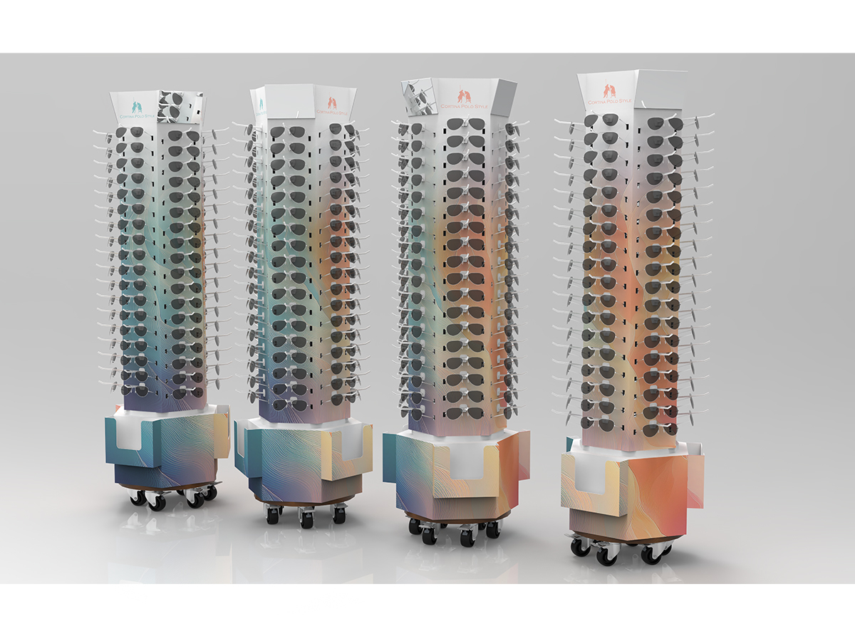 CORTINA POLO STYLE. ESPOSITORE GIREVOLE DA TERRA SU RUOTE IN CARTONE PLASTIFICATO PER ESPORRE 108 OCCHIALI. DIMENSIONI: H 180 CM DIAMETRO BASE 50 CM.