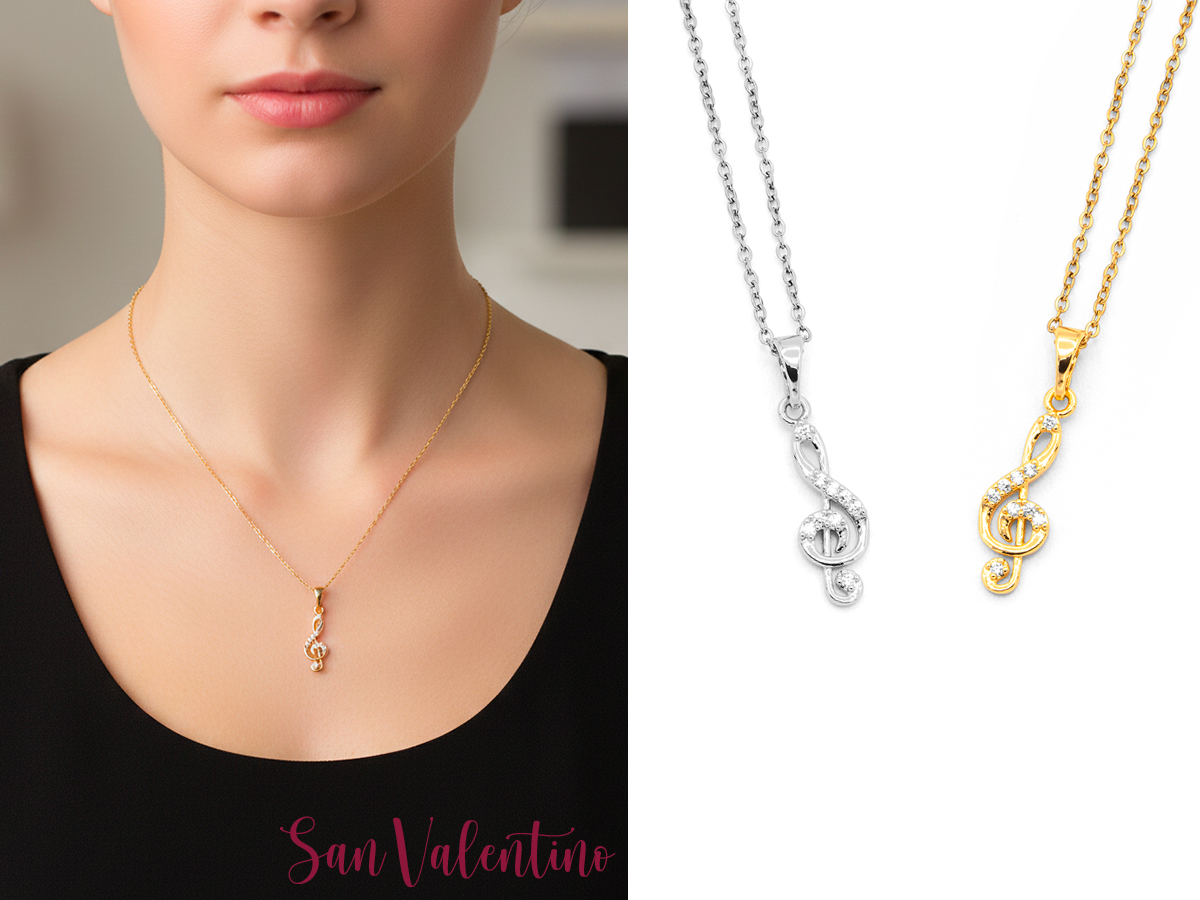 POLO CORTINA STYLE. COLLANA UNISEX IN ACCIAIO, OTTONE E ZIRCONI CON PENDENTE A NOTA MUSICALE. LUNGHEZZA COLLANA: DA 39 CM A 44 CM. COLORI ASSORTITI. CONFEZIONE: SCATOLA E SHOPPER.