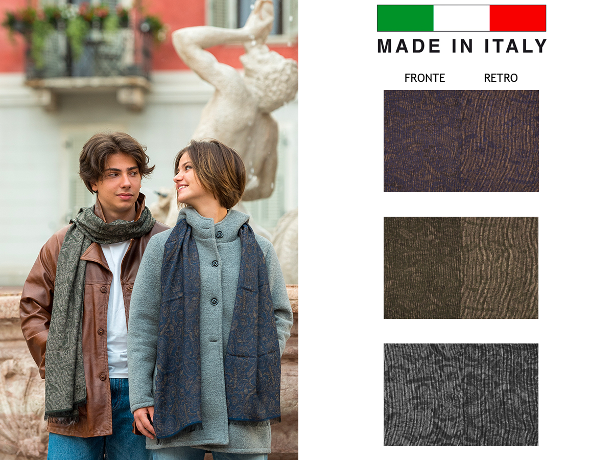 CORTINA POLO STYLE. SCIARPA UNISEX DOUBLE FACE FANTASIA DIS. CASHMERE MADE IN ITALY. COMPOSIZIONE: LANA 15% - CASHMERE 8% - MODAL 23% - POLY 27% - VISCOSA 27%. MISURA CM. 45X180. COLORI ASSORTITI. A CORREDO ELEGANTE SHOPPER.