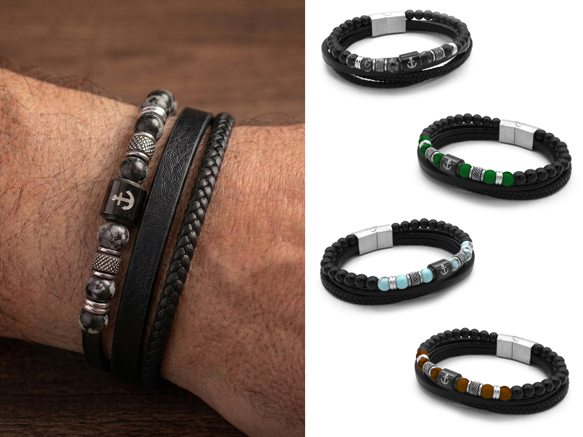 CORTINA POLO STYLE. UOMO BRACCIALE IN ACCIAIO,PIETRE E PELLE COLORI ASSORTITI. CONFEZIONE: SCATOLA E SHOPPER.